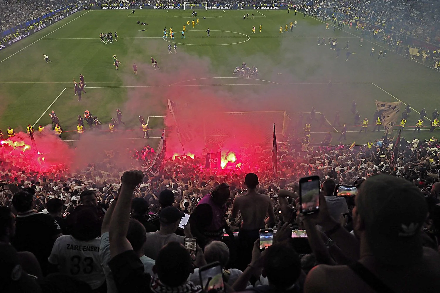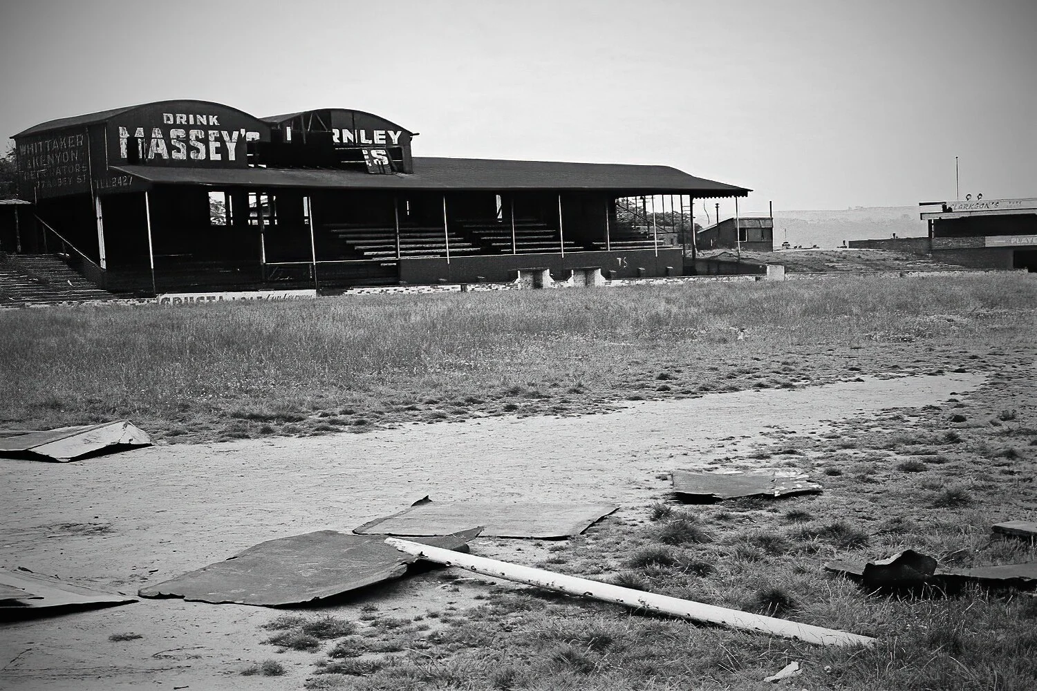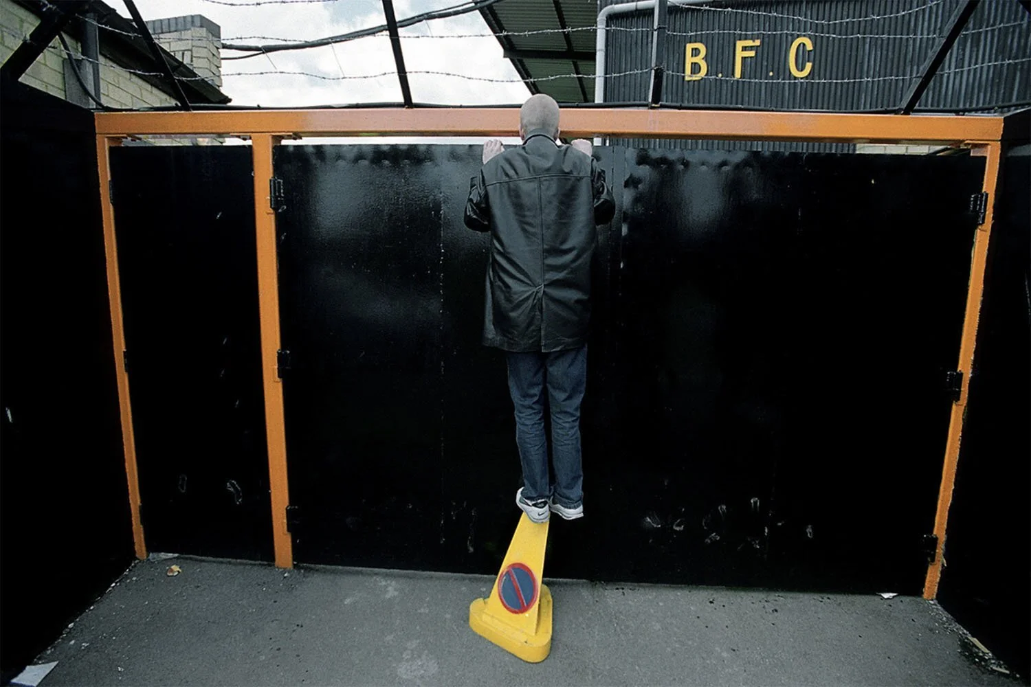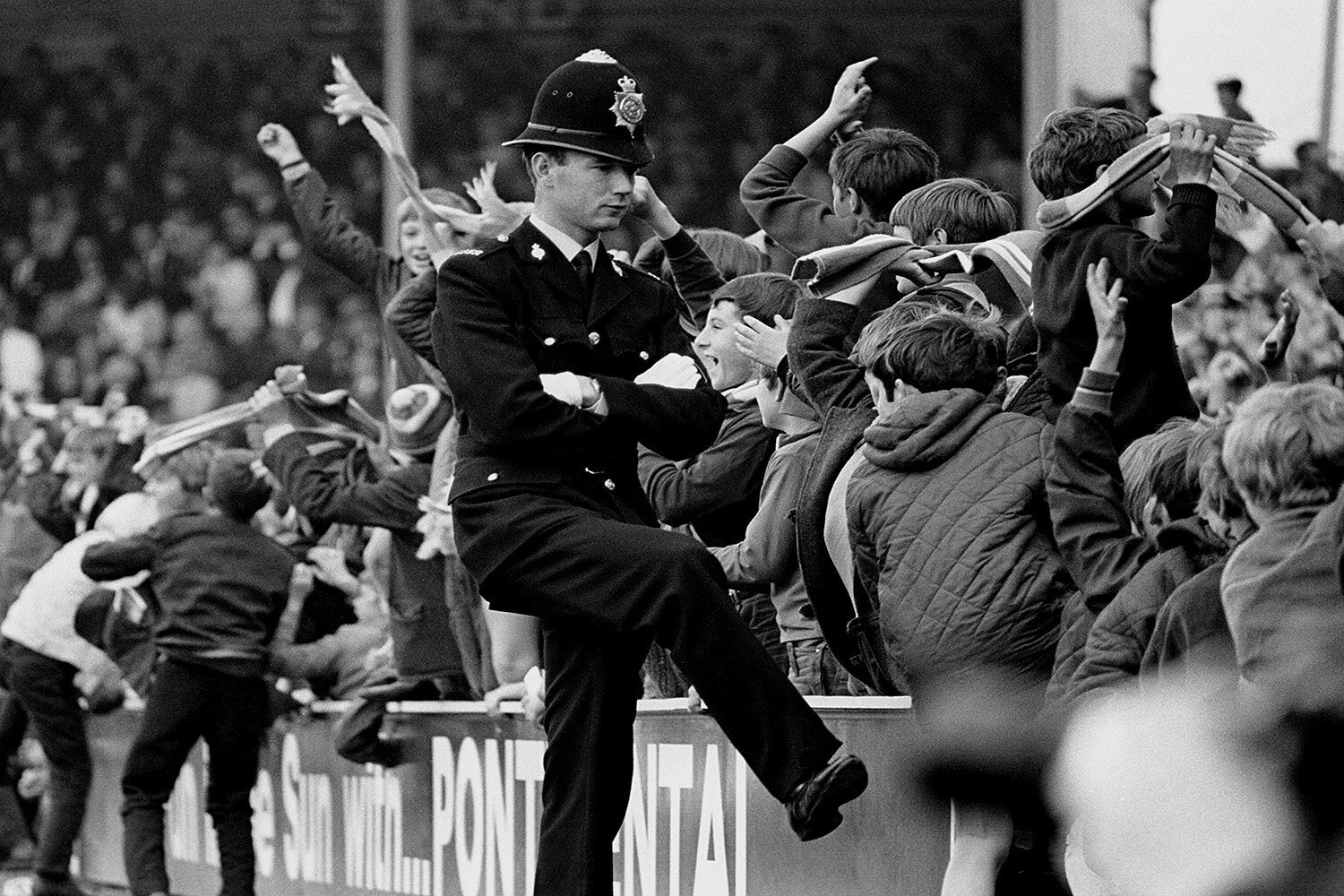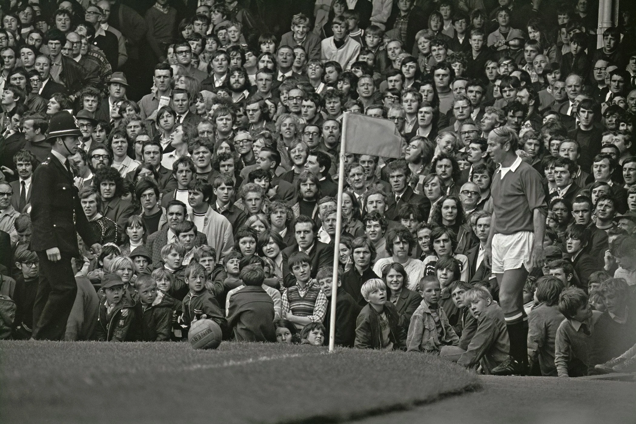 The kids are close enough to grab Bobby Charlton’s ankles as he prepares to take a corner. But gradually that all changes. Yes it’s the money, it always is. Football turns vibrant and bombastic . The LCD displays blink out messages of love. The pitches dry up, turn glossy green as country club fairways, the players, tanned like film stars, now look younger, the crowds older (because they are), the bigger stadiums more like shopping malls, the toilets flush, the food is almost edible, Messi is humble , and in Miami it’s forever Saturday.